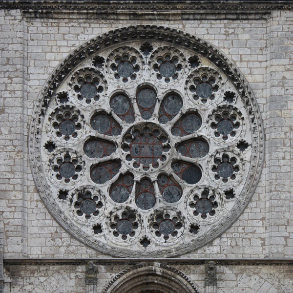 Небольшие круглые окна-окулюсы применялись и в романской архитектуре[19]. Ранняя прорезная роза появляется уже на западном фасаде базилики Сен-Дени. Более современная роза с переплётом из колонок, расположенных в форме спиц колеса, построена в 1200 году в Санлисе. Аналогичная ранняя роза украшает и фасад в Шартре (1215), но уже вскоре появляется роза Высокой готики в Ланском соборе (1200—1215)[20].