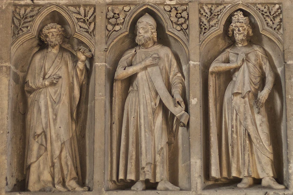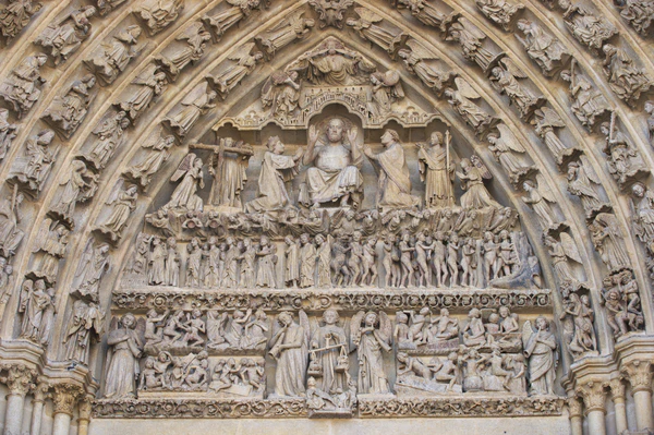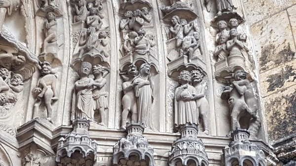 Скульптурное убранство — неотъемлемая черта готики, унаследованная у романского стиля. Из люнет под аркой портала каменные фигуры перешли на колонки и в ниши на фасаде. Тематика скульптур достаточно однородна: изображают святых, апостолов и королей. В конце XII века позы фигур ещё официальные, лица редко бывают обращены к другим статуям, разнообразие создаётся одеянием, либо сильно стилизованным, либо реалистичным. В XIII веке позы и лица становятся более живыми и выразительными[23].