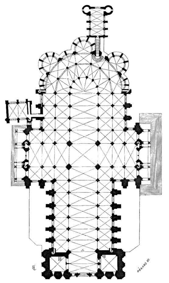 В романскую эпоху крупные церкви были монастырскими, что накладывало отпечаток на их планировку: монахам требовался отдельный вход на длинные хоры и развитый трансепт, в то время как для паломников необходимы были нартекс и боковые нефы как галереи для прохода в крипту с реликвиями. Основными памятниками Высокой готики являются городские соборы, предназначенные для мирян. В связи с тем, что реликвии выставляются у алтаря, крипта либо исчезает, либо, как в Шартре и Бурже, становится отдельной церковью. Верхний ярус боковых нефов упраздняется. Находят, что пятинефный план затрудняет обзор алтаря и богослужения из-за большого количества столбов, и западная половина собора становится трёхнефной (Шартр, Реймс, Амьен). Внешнее пространство между контрфорсами застраивается капеллами, в том числе и у более ранних соборов, как, например, в соборе Парижской Богоматери в 1240-е годы. В связи с этим торцы трансепта в Париже оказались утоплены в боковую стену, с чем нельзя было мириться, и относительно недавние фасады были снесены и выдвинуты вперёд в середине XIII века, что дало крупнейшие розы следующего, лучистого стиля[14].