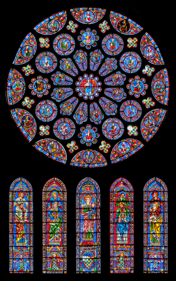 В 1215 году завершены большие окна трансептов в Шартре, ставшие образцами для других французских и заграничных соборов. Всего в Шартрском соборе 164 проёма и 2600 квадратных метров цветного стекла, причём значительное количество оригинальных витражей существует и ныне[21].