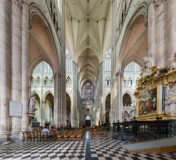 Высота сводов Амьенского собора достигает 42,5 м, они опираются на массивные столбы с четырьмя примкнутыми колонками, создающими в интерьере нефа господство вертикальных линий. Такая большая высота стен возможна благодаря высоким контрфорсам, которые подпирают их при помощи двухпролётных аркбутанов[8].