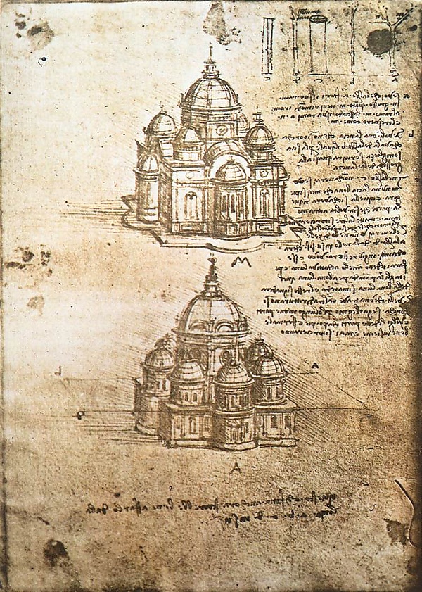 Главным автором проекта перестройки центра Рима при Папе Николае V (1447—1455) считают Л. Б. Альберти. Идеи этого архитектора и теоретика заложили основы искусства римского классицизма начала XVI века. Продолжателем классицистических идей Альберти стал Донато Браманте. С 1476 года Браманте работал на севере Италии, в Милане. Известно, что в 1482—1499 годах в Милане также находился Леонардо да Винчи. Предполагают, что Браманте и Леонардо обсуждали в Милане достоинства византийских крестово-купольных храмов[25]. Зарисовки купольных центрических сооружений на полях рукописей Леонардо да Винчи относятся именно к этому времени. Несколько ранее идею центрического плана идеального города выдвинул флорентиец Антонио Аверлино, по прозванию Филарете (1402—1469) в трактате «Сфорцинда». Схожие идеи излагал живописец, архитектор и скульптор Франческо ди Джорджьо Мартини (1439—1502) в «Трактате об архитектуре». Помимо круглых храмов типа ротонды архитекторы разрабатывали планы типа квадрифолия, или «четырёхлистника», тетраконха («с четырьмя конхами») и постройки «звёздчатого» плана, получаемого с помощью «поворотного квадрата» (двух наложенных друг на друга квадратов, один из которых повёрнут на 45°). Эти факты свидетельствуют о закономерности распространения идей центричности и регулярности в ренессансной архитектуре того времени[26].