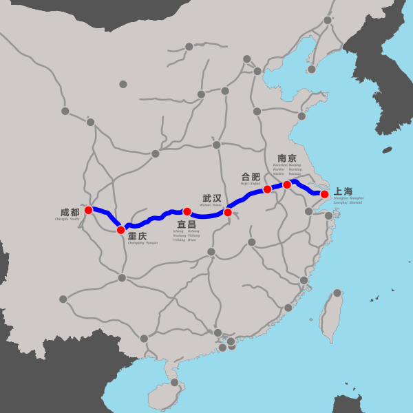 Почти вся дорога проходит к северу от Янцзы, за исключением начального участка Шанхай — Нанкин и участка Ичан — Чунцин.