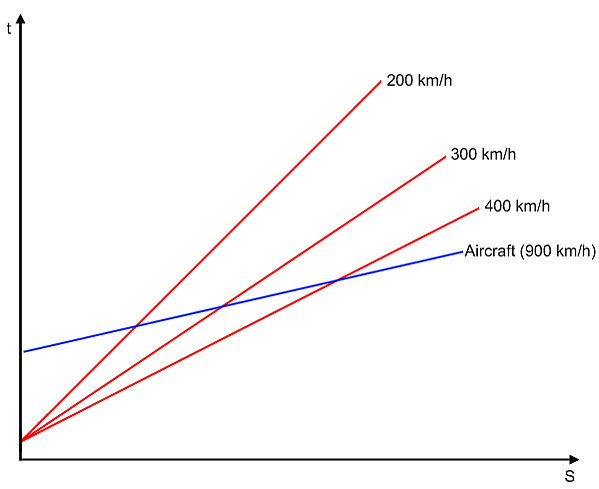 На начало 2011 года высокоскоростные поезда ещё не достигли скоростей пассажирских реактивных самолётов — 900—950 км/ч. Из этого можно сделать вывод, что на самолёте из города в город можно добраться быстрее, чем на поезде. Однако, здесь вступает в силу то обстоятельство, что аэропорты в своём большинстве находятся далеко от центра городов (из-за обширной инфраструктуры и высокого шума от самолётов), и дорога до них может занимать значительное время. Помимо этого, довольно продолжительное время (около 1 часа) занимает регистрация перед посадкой, а также накладные расходы на взлёт и приземление. В свою очередь, высокоскоростные поезда могут отправляться с центральных вокзалов города, а время от покупки билета до отправления поезда может занимать около 15 минут. Таким образом, данная разница во времени позволяет поездам иметь некоторое преимущество перед самолётами. На рисунке приведены графики приблизительного времени поездки на поездах и самолёте с учётом времени на поездку до вокзала или аэропорта и регистрацию. Исходя из него, можно увидеть, что до определённого расстояния общее время поездки на поезде будет меньше, чем на самолёте.