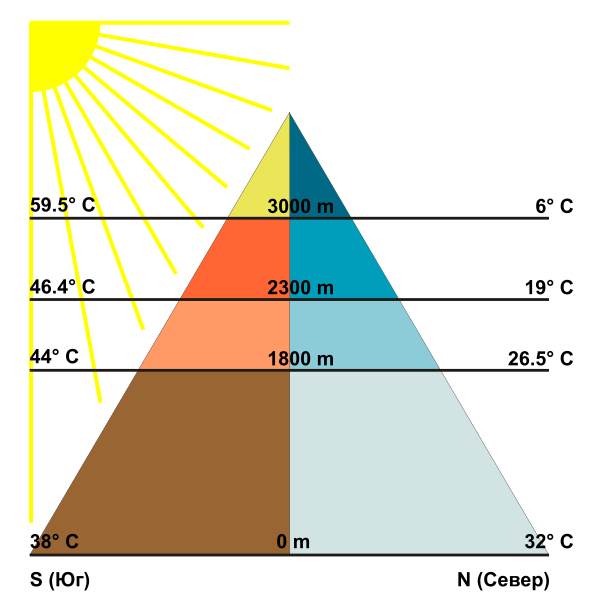 По мере нарастания высоты происходит смена ландшафтных поясов, в некоторой степени аналогичная широтной зональности. Величина солнечной радиации увеличивается вместе с увеличением теплопотерь поверхности. По этой причине температура воздуха снижается по мере роста высоты. Кроме того, происходит уменьшение количества осадков из-за барьерного эффекта.