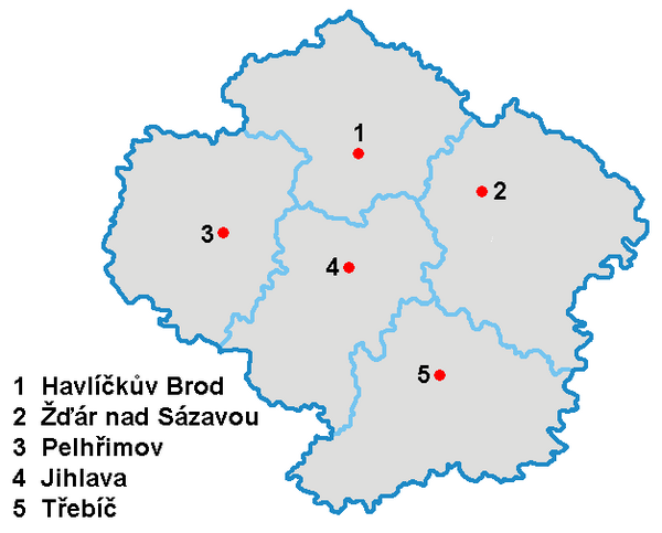 Край Высочина состоит из 5 районов, которые в свою очередь делятся на 15 муниципалитетов с расширенной полномочиями и 26 муниципалитетов[6] (Спелков и др.).