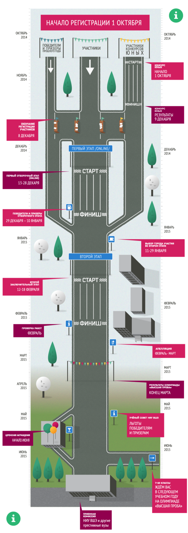 К участию допускаются школьники 7-11 классов из России, стран СНГ и Прибалтики. Для этого необходимо пройти регистрацию на сайте Архивная копия от 3 июля 2014 на Wayback Machine и получить логин и пароль от модератора. В назначенное время участник входит в систему и решает в течение ограниченного времени предложенные задания. Участники, набравшие достаточное количество баллов, после определения победителей и призёров 1 этапа могут выбрать в личном кабинете город участия Архивная копия от 10 марта 2015 на Wayback Machine во 2 этапе.