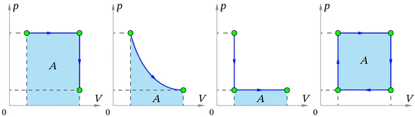 В термодинамике работа газа при изменении его состояния может быть вычислена по графику процесса на pV-диаграмме (давление p в зависимости от объёма V). Работа равна площади под кривой процесса на этой диаграмме.
