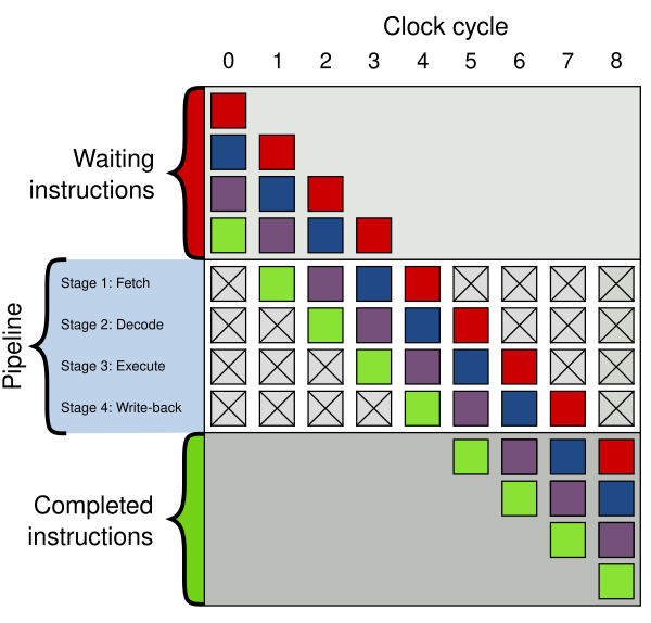 Вертикальная ось — последовательные независимые инструкции, горизонтальная — время. Зелёная колонка описывает состояние процессора в один момент времени, в ней самая ранняя, верхняя инструкция уже находится в состоянии записи в регистр, а самая последняя, нижняя инструкция — только в процессе чтения.