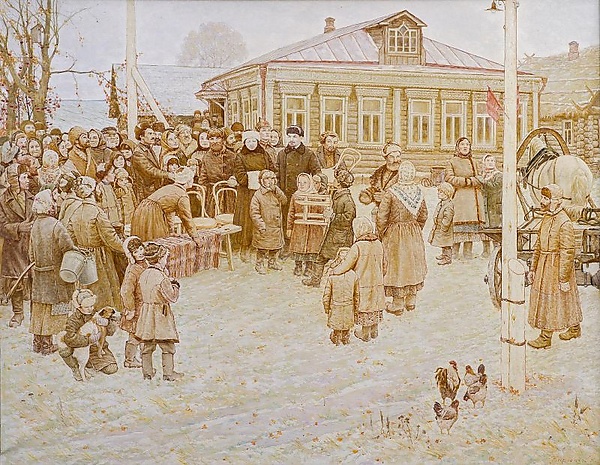 В левой части полотна изображена полукругом собравшаяся толпа крестьян и крестьянок, что подчёркивает массовый характер сцены. На правом фланге стоят Ленин и Крупская. В центре композиции размещены стулья и накрытая скамья, что может указывать на подготовку к собранию. На втором плане выделяется зелёный, украшенный резьбой дом под розовой крышей, а правее располагается изба, крытая соломой. Перед избой установлен столб с двумя красными флажками и лампочкой на вершине. У подножья столба находятся белая лошадь, три пёстрые курицы и петух, что дополняет сцену деталями сельского быта.