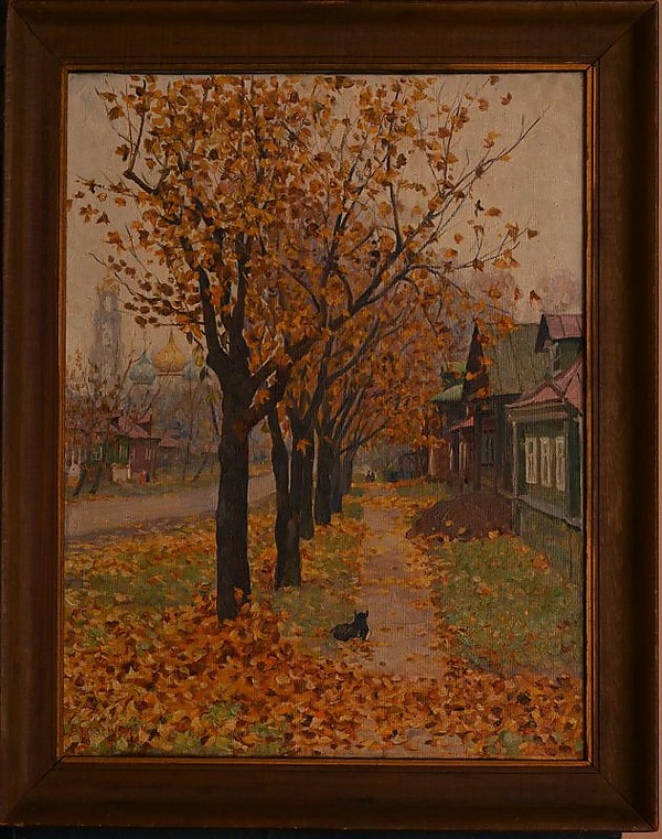 На картине представлен осенний городской пейзаж — ведута, изображающая улицу Кирова в Сергиев Посаде. На переднем плане показаны деревянные домики, деревья и дорожки, покрытые опавшими листьями. В глубине полотна слева виднеются силуэты колокольни и Успенского собора Троице-Сергиевой лавры. Работа выполнена в тёплой цветовой гамме с преобладанием жёлто-коричневых оттенков, дополненных зелёными и серыми тонами.