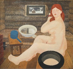 Вся плоскость холста отведена изображению сидящей в полный рост обнажённой молодой женщины, представленной в 3/4 развороте влево. Сцена разворачивается в интерьере деревянной бани, что подчёркивает бытовой характер работы. В верхней части композиции располагается окно, через которое видна деревенская улица, создавая ощущение связи внутреннего пространства с окружающей деревней. Картина относится к жанру ню.