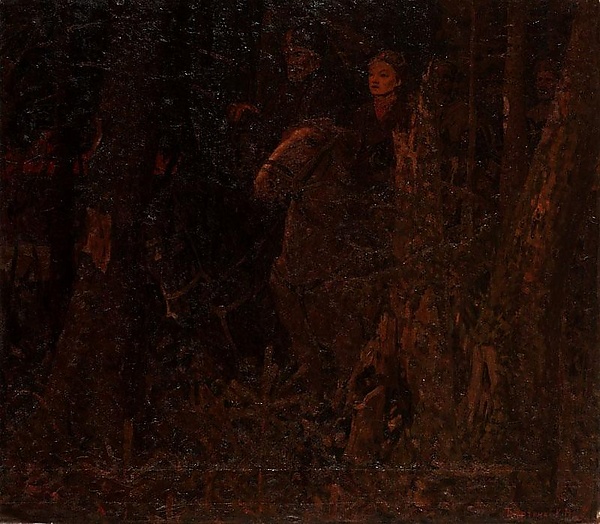 На переднем плане изображены два всадника в шапках с красными ленточками: пожилой мужчина с окладистой бородой на коричневой лошади и светловолосый юноша в красной косоворотке с автоматом наперевес на рыжем коне. Старик отодвигает ветку высокой сосны, за которой виднеется зарево, отбрасывающее красноватые отсветы на лица всадников и стволы деревьев, что придаёт сцене выразительную цветовую гамму. Справа от юноши находится сломанная сосна, далее — ещё два больших ствола деревьев, формирующих часть композиции. За деревьями различимы трое бородатых мужчин в шапках и коричневая морда лошади. В просвете между деревьями открывается тёмно-синее небо, а у ног лошадей расположены две маленькие ёлочки.