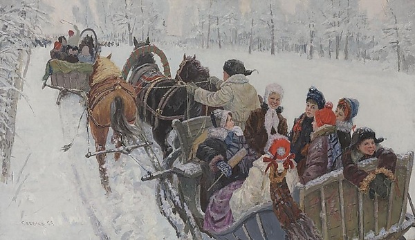 Композиция построена на изображении "санного поезда", движущегося по заснеженной дороге, окружённой лесом. Центральное место занимает большая пара саней, запряжённых тройкой лошадей. Возница в шапке-ушанке и светлом тулупе показан спиной к зрителю. В санях размещены шесть девочек школьного возраста в ярких одеждах и мальчик в коричневой одежде и рукавицах; дети изображены в разных поворотах, с улыбками на румяных лицах. На дальнем плане видны другие сани и многочисленные фигуры людей, намеченные отдельными мазками. На фоне белого снега выделяются насыщенные оттенки красного, синего, лилового, серого и коричневого, использованные в цветовой гамме одежды, саней и упряжи. Работа отличается многослойной, местами пастозной живописью.