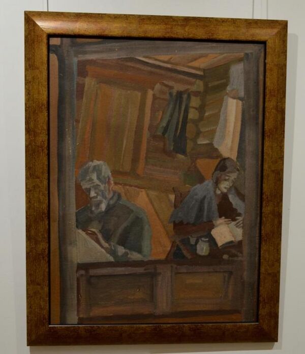 В композиции, обрамлённой оконной рамой, изображены мужчина с бородой и усами, сидящий слева с наклонённой головой, занят письмом или рисованием. Справа за столом находится женщина в серой шали, погружённая в чтение. Сцена разворачивается в интерьере крестьянской избы, что подчёркивает характерную для бытового жанра повседневную атмосферу. Элементы композиции акцентируют внимание на занятиях персонажей и их взаимодействии с окружающей обстановкой.