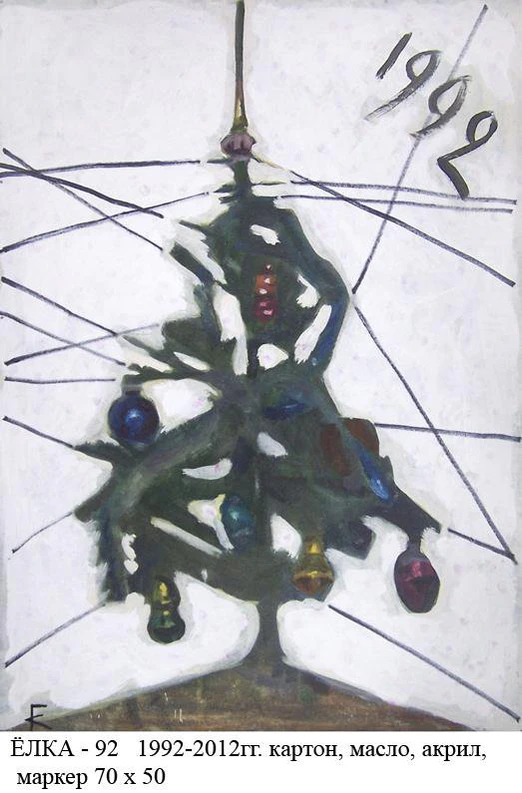 На полотне на белом фоне изображены два фрагмента чёрных прямоугольных столов: один расположен в левой верхней части, другой — справа. На краю правого стола размещена большая чёрная бутылка с ярко выраженным белым вертикальным бликом. Композиция характеризуется лаконичностью и контрастом, что типично для жанра натюрморта и подчёркивает внимание к форме и свету в композиционном построении.
