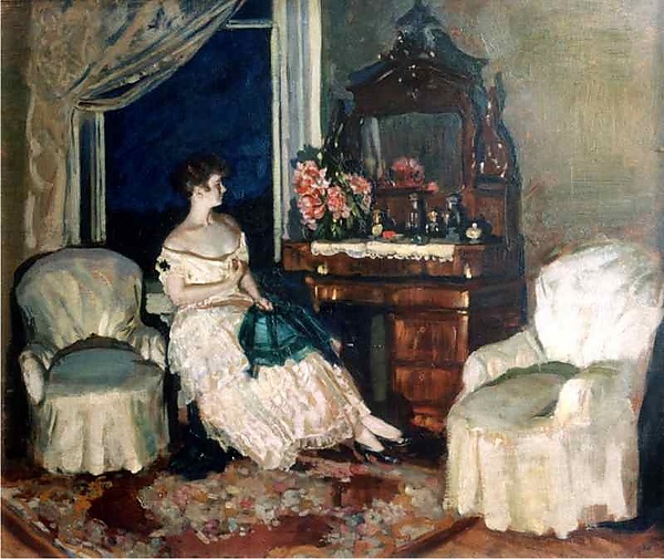В центре интерьера изображена молодая женщина, сидящая у трюмо с туалетным столиком в светлом платье с глубоким круглым вырезом и обнажёнными плечами. Фигура показана в 3/4 поворота вправо, лицо обращено в профиль. На столе слева размещён букет розово-сиреневых цветов и несколько флаконов разнообразных форм. Фоном служит открытое окно с поднятой занавеской тёмно-синего цвета. По обе стороны от стола расположены два кресла зеленовато-серого оттенка, что дополняет композиционное решение и подчёркивает атмосферу уюта в интерьере.