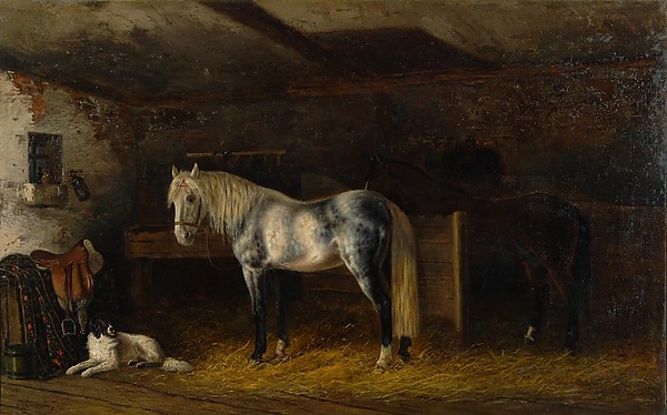 В центре композиции изображена серая в яблоках лошадь, стоящая боком к зрителю, с повернутой влево головой, светлой гривой и хвостом. На дальнем плане, за досчатой перегородкой в полумраке конюшни, различим силуэт гнедой лошади. Слева находится небольшое оконце, под которым на тёмной ткани с красным узором лежит коричневое седло, а рядом — светлая лохматая собака с чёрной головой. На досчатом полу разбросана солома. Источник света расположен слева, освещая передний план и подчёркивая детали композиции.
