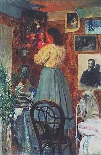 Композиция картины строится вокруг угловой части комнаты, где в центре изображена женщина в светлой блузе и серой юбке, стоящая на стуле с ажурной спинкой перед иконой. Женщина показана спиной к зрителю в развороте три четверти, её распущенные волосы и лицо, освещённое снизу лампадкой, подчёркивают интимную атмосферу сцены. Под иконой размещены маленькие картинки в рамках, а под ними стоит стол, заваленный стопками книг и бумаг. Слева от стола находится домашнее растение с длинными стеблями и узкими листьями. В правой части картины видна часть железной кровати с витой спинкой, на которой лежат подушка и белое покрывало. На стене справа от женщины размещены репродукции и портрет мужчины без рамы. В цветовой гамме композиции преобладают серые и охристые оттенки, что усиливает ощущение повседневности и уюта.