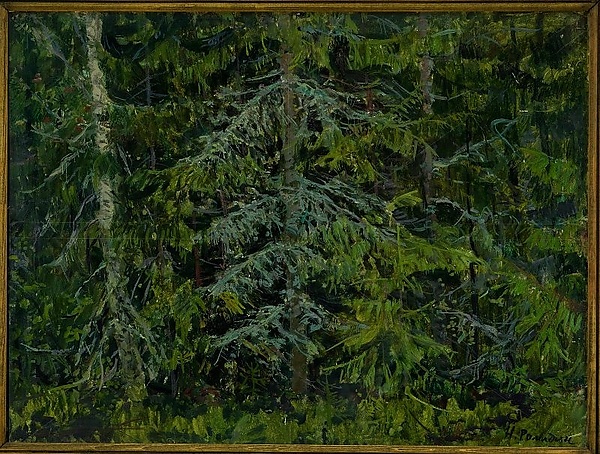 На картине изображён густой хвойный лес, занимающий всю ширину полотна. Основной массив составляют заросли елей и сосен, среди которых местами выделяются ярко-красные гроздья калины или рябины. Верхняя часть композиции обрезает вершины деревьев, что подчёркивает горизонтальное построение композиции и акцентирует внимание на плотности леса и деталях подлеска.
