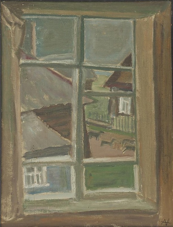 Картина представляет собой фрагментарную композицию в жанре пейзажа, выполненную в виде вида из окна. На переднем плане изображено окно с светлым подоконником, через которое открывается вид на одноэтажные и двухэтажные дома с двускатными крышами, дорогу со стаей собак, а также фрагменты построек и невысокий забор. На втором плане располагается зелёное поле и узкая голубая полоса, предположительно изображающая реку. Третий план занимает серо-голубое с бирюзовым безоблачное небо. Работа выполнена в сдержанной цветовой гамме, включающей серые, голубые, бирюзовые, коричневые, бордовые, белые и зелёные оттенки.