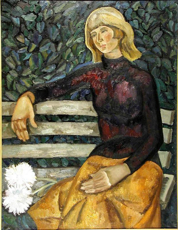 На картине изображена молодая женщина, сидящая на голубой скамье со спинкой на фоне густой зелёно-синей листвы. Фигура представлена поколенно, с поворотом головы на три четверти влево. Женщина одета в красную юбку и тёмно-зелёную безрукавку с высоким воротом. Тёмно-каштановые волосы, прямой нос и тёмные брови подчёркивают выразительность лица. Левая рука покоится на коленях, правая согнута в локте и опирается на спинку скамьи. Справа от женщины на скамье лежат две бело-сиреневатые хризантемы. Композиция и цветовая гамма строятся на сочетании насыщенных зелёных, синих и красных оттенков.