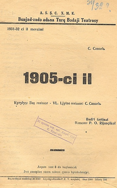 Приехавший в Баку драматург Всеволод Вишневский, посмотрев в 1934 году на сцене Русского бакинского театра пьесу «В 1905 году», писал: