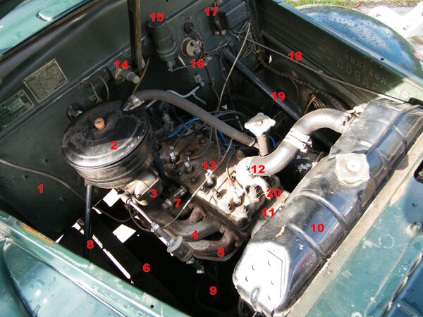 Четырёхцилиндровый двигатель ГАЗ-69, левая сторона 1 — головка блока цилиндров 2 — блок цилиндров 3 — прерыватель-распределитель зажигания 4 — катушка зажигания 5 — фильтр радиопомех 6 — рулевая колонка 7 — стартер 8 — педальный привод включения стартера 9 — генератор постоянного тока 10 — вентилятор 11 — радиатор 12 — помпа (центробежный насос) 13 — ремень вентилятора 14 — маслозаливная горловина 15 — полнопоточный масляный фильтр грубой очистки 16 — кран выключения масляного радиатора (на зиму) 17 — место для установки предпускового подогревателя 18 — левое переднее крыло |
