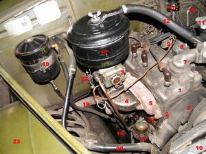 Четырёхцилиндровый двигатель ГАЗ-69, правая сторона 1 — головка блока цилиндров 2 — блок цилиндров 3 — карбюратор 4 — впускной коллектор 5 — выпускной коллектор 6 — помпа (центробежный насос) 7 — крышка термостата 8 — прерыватель-распределитель зажигания 9 — вакуумный регулятор опережения зажигания 10 — радиатор 11 — маслозаливная горловина 12 — шланг вентиляции картера 13 — катушка зажигания 14 — фильтр радиопомех 15 — инерционно-масляный воздухоочиститель 16 — масляный насос 17 — крышка клапанов 18 — масляный фильтр тонкой очистки 19 — выхлопная труба 20 — трубопровод к отопителю салона 21 — бензонасос с фильтром 22 — привод заслонок карбюратора 23 — правое переднее крыло |