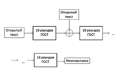 - К полученному результату побитно по модулю 2 прибавляется следующий блок открытых данных. Последний блок при необходимости дополняется нулями. Сумма также шифруется в соответствии с пунктом 1.