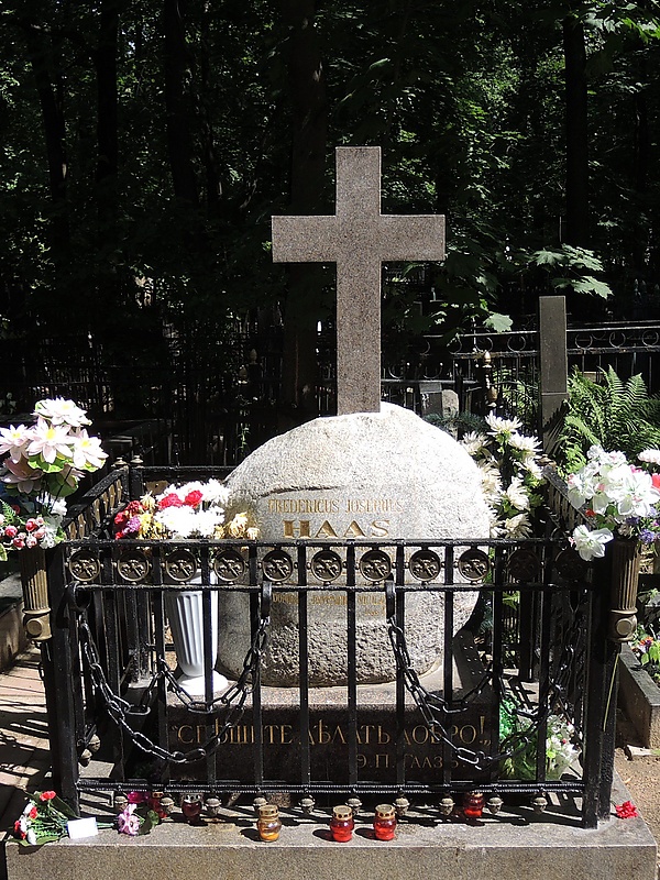 На могиле Гааза установили памятник: гранитная глыба с установленным на нём шлифованным гранитным крестом. Надпись гласит: «FREDERICUS JOSEPHUS HAAS, natus Augusti MDCCL XXX, denatus XVI Aug. MDCCCLIII» (Фридрих Иосиф Гааз, родился в августе 1780 года, умер 16 августа 1853 года). Она дополнена цитатой от Луки XII:37 на латыни[45]. На постаменте сбоку надпись — «Спешите делать добро»[72][143].