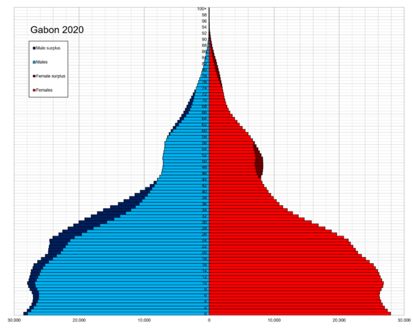 Годовой прирост населения Габона — около 2,5 %. Уровень рождаемости в 2020 году — 26,3 рождений на тысячу жителей, а суммарный коэффициент рождаемости — 3,41 рождений на женщину. В том же году общий показатель смертности держался на отметке в 5,9 умерших на тысячу жителей, младенческая смертность в среднем составила 30,4 смертей на тысячу новорождённых (у мальчиков — 33,6; у девочек 27). Из страны эмигрировало свыше 8700 человек (3,9 человека на тысячу жителей)[14].