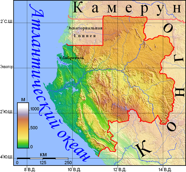 Общая протяжённость границы 2551 км, длина береговой линии — 885 км. Береговую линию страны на две части разделяет мыс Лопес. К югу от него берега прямолинейные, плоские, с мелководными лагунами. К северу от мыса береговая линия имеет более сложные очертания, здесь расположены удобные бухты — эстуарии рек страны[13].