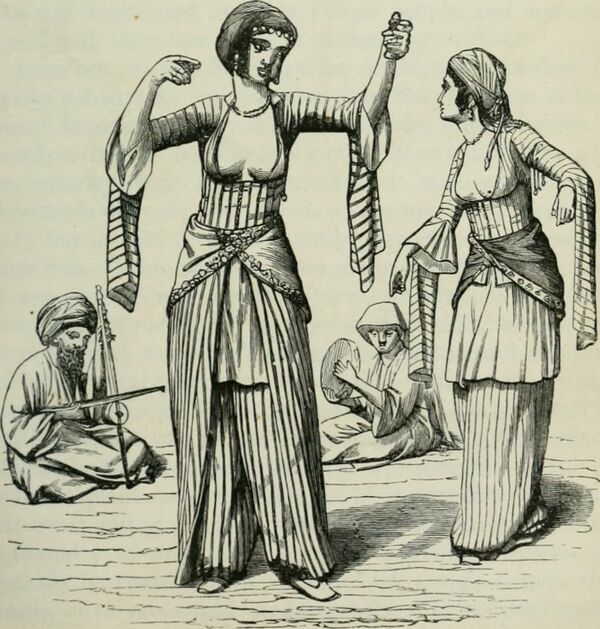 «На улице гавази танцуют в одежде, какую обычно носят женщины среднего сословия у себя дома в гареме, то есть в йяляке или антари и шинтиян — все из красивых тканей…