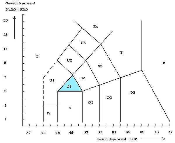 Средний химический состав близок к базальту, с более высоким содержанием щелочей:[3]