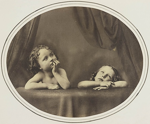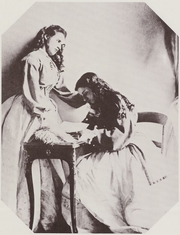 Фотография находится в коллекции Музея Виктории и Альберта (англ. «Studies from Life or Photographic Study», инв. 267—1947). Она сделана около 1864 года в доме Гаварденов в Южном Кенсингтоне. Размер позитива — 23,5 × 24,8 см. Техника — альбуминовая печать со стеклянного негатива, сделанного на основе влажного коллодионного процесса. Аннотация к фотографии на сайте музея предполагает, что Клементина, стоящая перед своей сестрой, как зеркало, возможно, отражает выражение лица Изабеллы Грейс. Взаимопонимание двух девушек визуально подчёркивается за счет линий окна, которые направляют взгляд зрителя на их изящно соединённые руки[113].