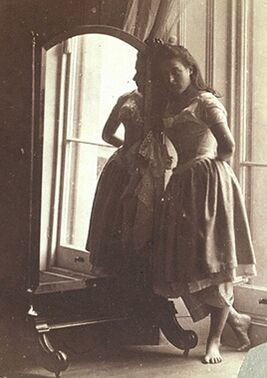С этой фотографией связано возникновение интереса к творчеству Клементины Гаварден в новейшее время. Внучка фотографа Клементина Тоттенхэм посетила выставку, на которой ей показалась знакомой девушка с одного из представленных в экспозиции снимков. Это был снимок дочери Клементины Гаварден, позирующей матери между окном на балкон и высоким зеркалом на подвижной раме. Тоттенхэм прочитала в аннотации к фотографии, что она была сделана её бабушкой. В каталоге выставки фотография носила название «Туалет». Марк Хаворт-Бут писал, что более удачным было бы «Туалетная вода», но в действительности им должно было быть «Фотографический этюд» или «Этюд с натуры»[88].
