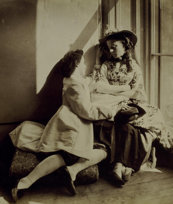 На некоторых снимках с двумя дочерьми фотограф «играет» с принятыми в светском обществе правилами и ритуалами ухаживания. На таких фотографиях её дочь Клементина обычно исполняет роль назойливого любовника-мужчины, а другая дочь Изабелла Грейс Мод — девушку, в которую он влюблён. Действие разыгрывается на голом деревянном полу, а не в ландшафте романтического леса, как это можно было бы ожидать. Клементина на одной из таких фотографий не сжимает в объятьях Изабеллу Грейс, а лишь едва прикасается пальцами к краю её шляпы, что свидетельствует о деликатности внешнего выражения сильных чувств, которые она испытывает. Общая тень, которую отбрасывают героини фотографии на стену, по мнению Додье, также свидетельствует о близости персонажей друг к другу[54]. Напротив, Майкл Бартрам пишет о проявлении преувеличенных эмоций на снимках фотографа: её дочери падают на пол и оказываются не в состоянии встать под влиянием сильных переживаний, они пойманы в «переплетении драпировок и длинных волос», склоняются над туалетными столиками[70].