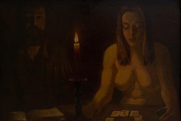 На первом плане полотна, выполненного в традициях бытового жанра, изображены мужчина и женщина, сидящие за столом. В правой части композиции находится обнажённая женщина, занимающаяся гаданием на картах. В левой части за столом сидит мужчина, перед которым лежит открытая книга. Между персонажами в центре стола горит свеча, акцентируя внимание на их взаимодействии и создавая выразительное освещение сцены.