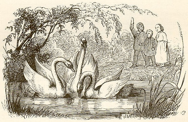 После этого утёнок сбежал с болота и после целого дня скитаний заметил избушку, где проживали старушка, кот и курица. Старушка оставила птенца у себя, в надежде что он будет нести яйца. Кот и курица, жившие в доме, стали насмехаться над утёнком, и когда ему вдруг захотелось плавать, он не нашёл у них понимания и ушёл жить на озеро. Однажды на озере гадкий утёнок увидел лебедей и полюбил их, как не любил до сих пор никого. Но подойти к ним он так и не решился, боясь, что будет так же отвергнут, как раньше.