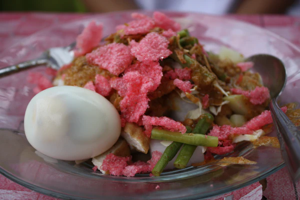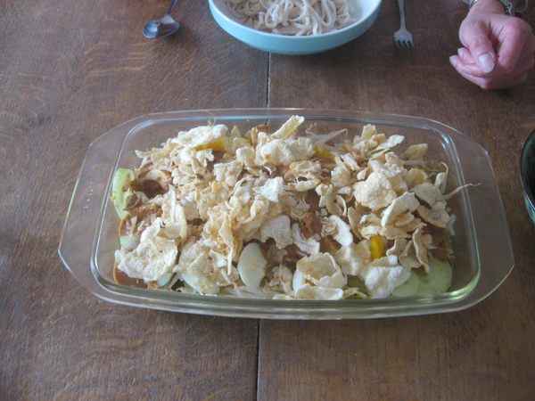 Уже смешанное и залитое соусом гадо-гадо очень часто посыпается крупуком различных видов, в частности, ремпейе́ком, приготовляемым с добавлением растёртого либо дроблёного арахиса, или эпми́нгом, приготовляемым из растёртых жареных плодов мелинджо, а также жареными стружками репчатого лука[1][6][8].