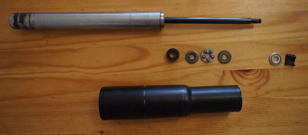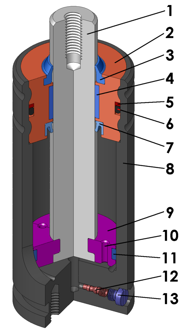Типовая промышленная газовая пружина представляет собой герметичный цилиндр (8) в котором свободно перемещается шток (1). Втулка (2), пыльник (3), подшипник скольжения(4) и сальники (6, 7) обеспечивают герметичное перемещение штока. Центрирующая втулка-поршень (9) и перепускной клапан (10) предохраняют шток от перекоса и обеспечивают демпфирующие свойства пружины.[1]