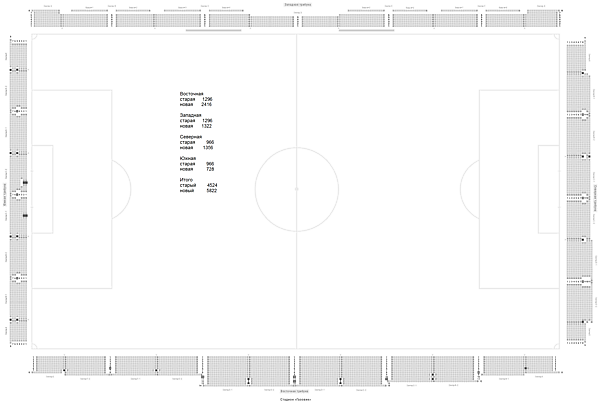В ходе реконструкции 2014—2016 годов озвучивались разные данные относительно итоговой вместимости стадиона — 7500[7], 8000[16] 10000[6][17], 10500 зрителей[8], однако фактически после открытия всех трибун в сентябре 2016 года общее количество зрительских кресел составило 6298 (включая 8 VIP-лож, но не учитывая места для прессы и ложу для почётных гостей)[18]. В зимний перерыв сезона 2016/2017 было решено произвести локальное увеличение количества мест за счёт более рационального использования пространства над верхними рядами некоторых трибун[19], в результате чего на Восточной и Северной трибунах появились новые ряды и общая вместимость стадиона увеличилась до 6489 мест[18].