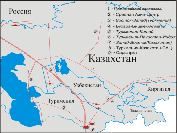 Все нефтяные и газовые месторождения Казахстана расположены на западе страны в Прикаспийской впадине. Во всей остальной части государства основным топливом был уголь Экибастуза и Караганды. Через запад Казахстана проходили магистральные газопроводы Советского Союза: «Бухара – Урал» (1963), «Средняя Азия — Центр» (САЦ, 1967) и Хива (Узбекистан) – Бейнеу – Александров Гай (Россия), Прорва (Казахстан) – Кенкияк – Орск (Россия). Bсе потоки среднеазиатского и казахстанского газа были направлены на территорию современной Российской Федерации, а через нее дальше в Европу, а Казахстан служил практически лишь маршрутным «мостиком» для транспортировки голубого топлива.