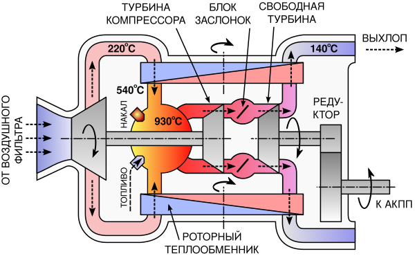 Режим работы двигателя управлялся как плавно, автоматом подачи топлива и углом установки лопаток соплового аппарата, так и ступенчато — отсечкой подачи топлива. Когда водитель убирал ногу с педали газа, автоматика отключала подачу топлива, но двигатель продолжал работать: некоторое время вращение поддерживала остаточная тепловая энергия, накопленная роторами теплообменников. При последующем нажатии на педаль газа подача топлива восстанавливалась. В отличие от авиационных турбомоторов свеча, поджигавшая топливо, была подключена к магнето постоянно, поэтому горение возобновлялось почти без задержки[52][53]. Смазка машинным маслом, привычная в поршевых двигателях, в ГТД могла применяться только в относительно слабо нагруженных узлах (редукторы, привод регенератора). В подшипниках турбинных валов, работавших при высоких оборотах и высоких температурах, конструкторы применили газовые подшипники. Воздух в зазоры подшипников, толщиной в несколько микрон нагнетался самими турбинами[54].