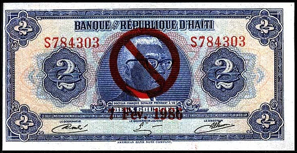 Надпечатка закрывала изображения Бэби Дока и его отца Папы Дока, которых впоследствии сменили изображения исторических деятелей, оставивших о себе лучшую память в истории Республики Гаити — например, Туссен-Лувертюра.