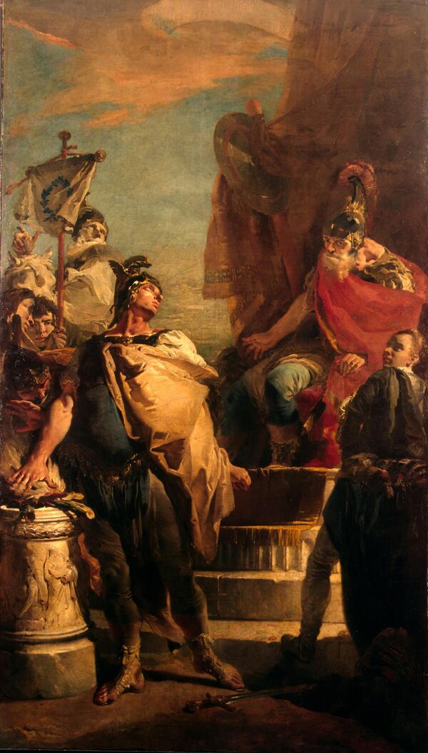В 1725—1729 годах итальянский живописец Дж. Б. Тьеполо работал по заказам Дионисио Дольфино, патриарха Аквилеи. Для отдельного зала Палаццо Дольфин-Манин в Венеции он выполнил десять картин-панно одинакового формата на темы из героической истории Древнего Рима. Позднее они были рассеяны наследниками. Пять картин и среди них: «Муций Сцевола в лагере Порсены» на аукционной распродаже в Париже в 1876 году приобрёл А. А. Половцов для Училища технического рисования барона Штиглица в Санкт-Петербурге. С 1923 года картина находится в Эрмитаже[5].