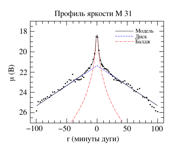 Распределение яркости в диске экспоненциальное, а характерный радиус диска вблизи оптического диапазона зависит от длины волны, уменьшаясь для более коротких волн. Так, характерный радиус диска в полосе U составляет 7,5 килопарсеков, в полосе V — 5,7 килопарсека, а в полосе K — только 4,4 килопарсека. Таким образом, окраина диска имеет более голубой цвет и более молодое звёздное население, чем центральные области[21][22].