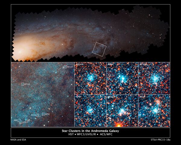 В галактике Андромеды известны скопления с большим количеством звёзд, по возрастам занимающие три диапазона: первый — от 100 до 500 миллионов лет, второй — около 5 миллиардов лет, третий — 10—12 миллиардов лет, при этом некоторые из таких скоплений относятся к диску галактики. В отличие от галактики Андромеды, в Млечном Пути скопления с большим количеством звёзд — шаровые скопления — практически одинаково старые, с возрастом 10—12 миллиардов лет, а молодые отсутствуют[41][42].