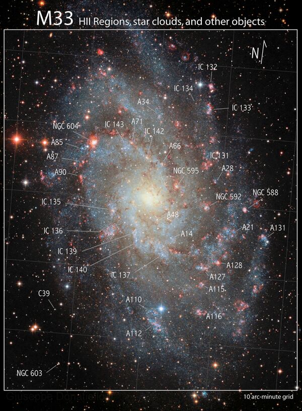 Также Гершель в 1784 году открыл крупнейшую и самую яркую в галактике область H II, которая позже вошла в Новый общий каталог как NGC 604. Кроме неё в Новый общий каталог попали NGC 588, 592 и 595, которые открыл Генрих Луи Д'Арре в 1864 году, а сама M 33 получила в этом каталоге обозначение NGC 598[68]. Ещё 11 объектов галактики, которые открыл Гийом Бигурдан в 1889 году, попали в Индекс-каталог: IC 131, 132, 133, 134, 135, 136, 137, 139, 140, 142 и 143[15][69].